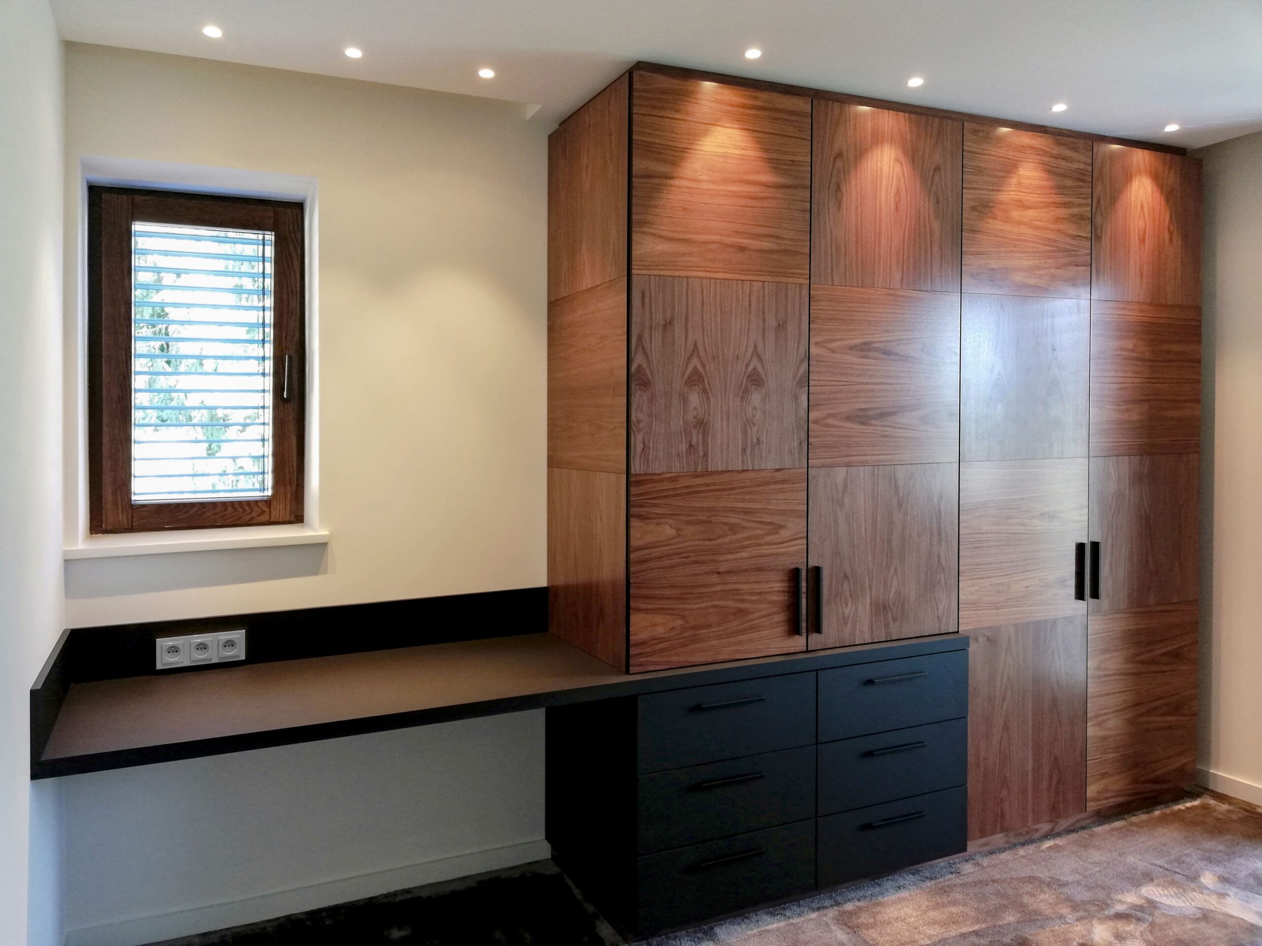 Dans cette maison d’Oberhausbergen, nos clients souhaitaient une chambre à coucher qui allie confort, élégance et praticité. Nous avons imaginé un espace sur mesure où chaque élément trouve sa place : un coin dressing, un bureau discret et un meuble de salle de bain intégré dans la continuité du projet.