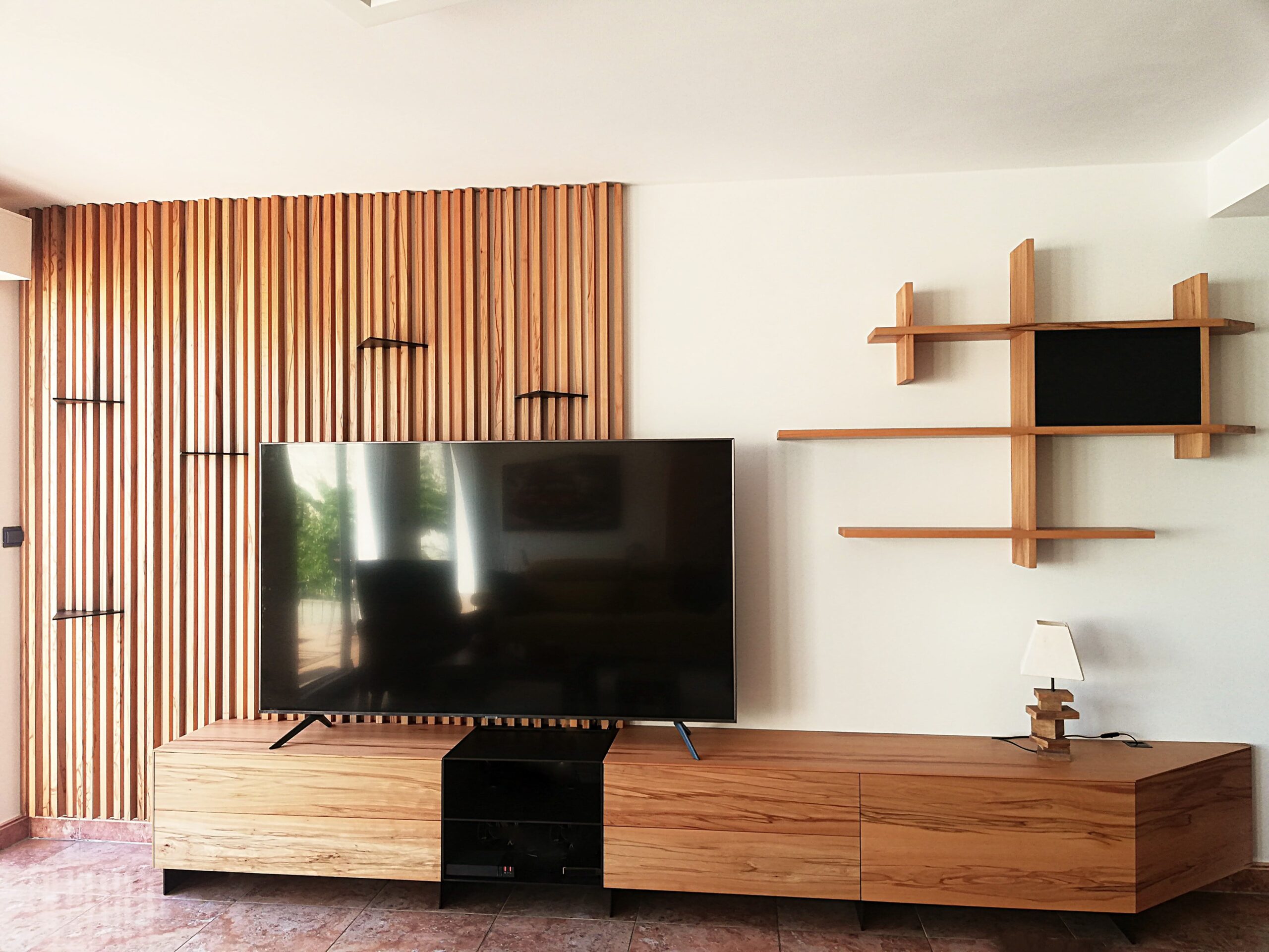 Dans ce salon à Romanswiller, le meuble TV est devenu bien plus qu’un simple rangement : il structure l’espace et affirme le style de la pièce. Avec un claustra en bois massif et métal thermolaqué noir, l’ensemble organise l’espace tout en laissant passer la lumière et en apportant du caractère.